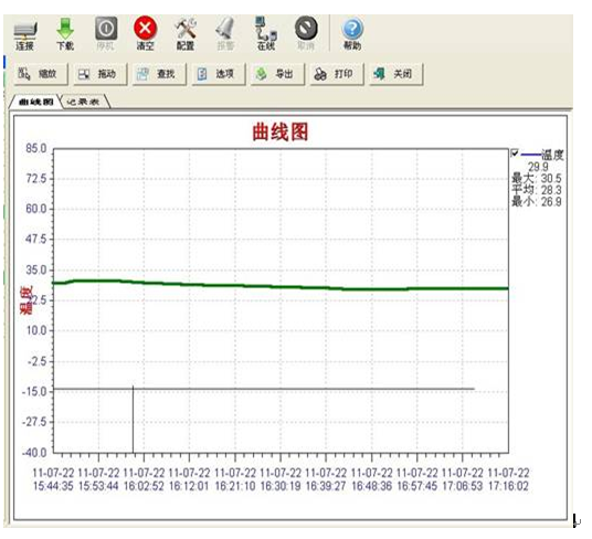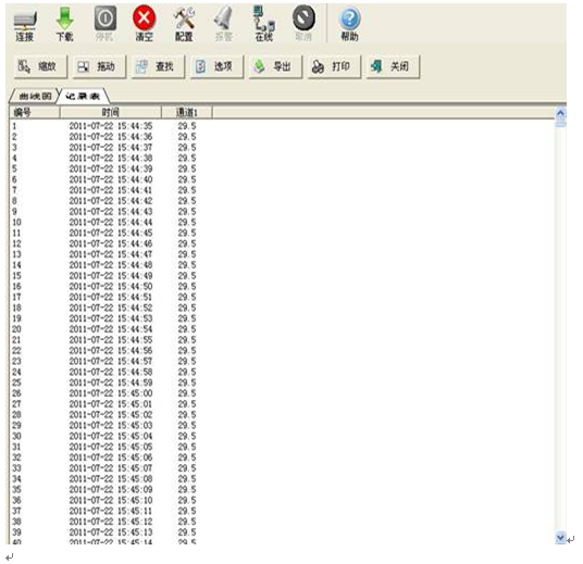 YBJL-803型温度数据记录仪是配置了配套的记录数据分析处理软件,采用流行的windows界面;可以通过简单操作,完成便携式数据记录仪的工作状态设置,完成数据记录仪的历史数据读取,还可读取连线记录仪的当前测量参数(即数据仪连上电脑后,可通过电脑屏幕时时读取记录仪所测量记录到的温湿度值)。温度数据采用列表和曲线图方式显示。所有数据可以按照text或者excel格式进行输出,通过Microsoft excel程序对数据进行处理,绘制折线图、拼图,进行曲线拟合等。